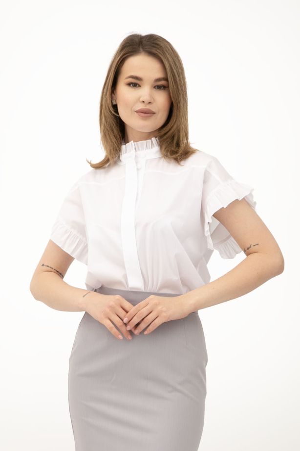 Біла сантинова жіноча блуза з тонкої попліни з рюшами Флорет - якість, перевірена часом