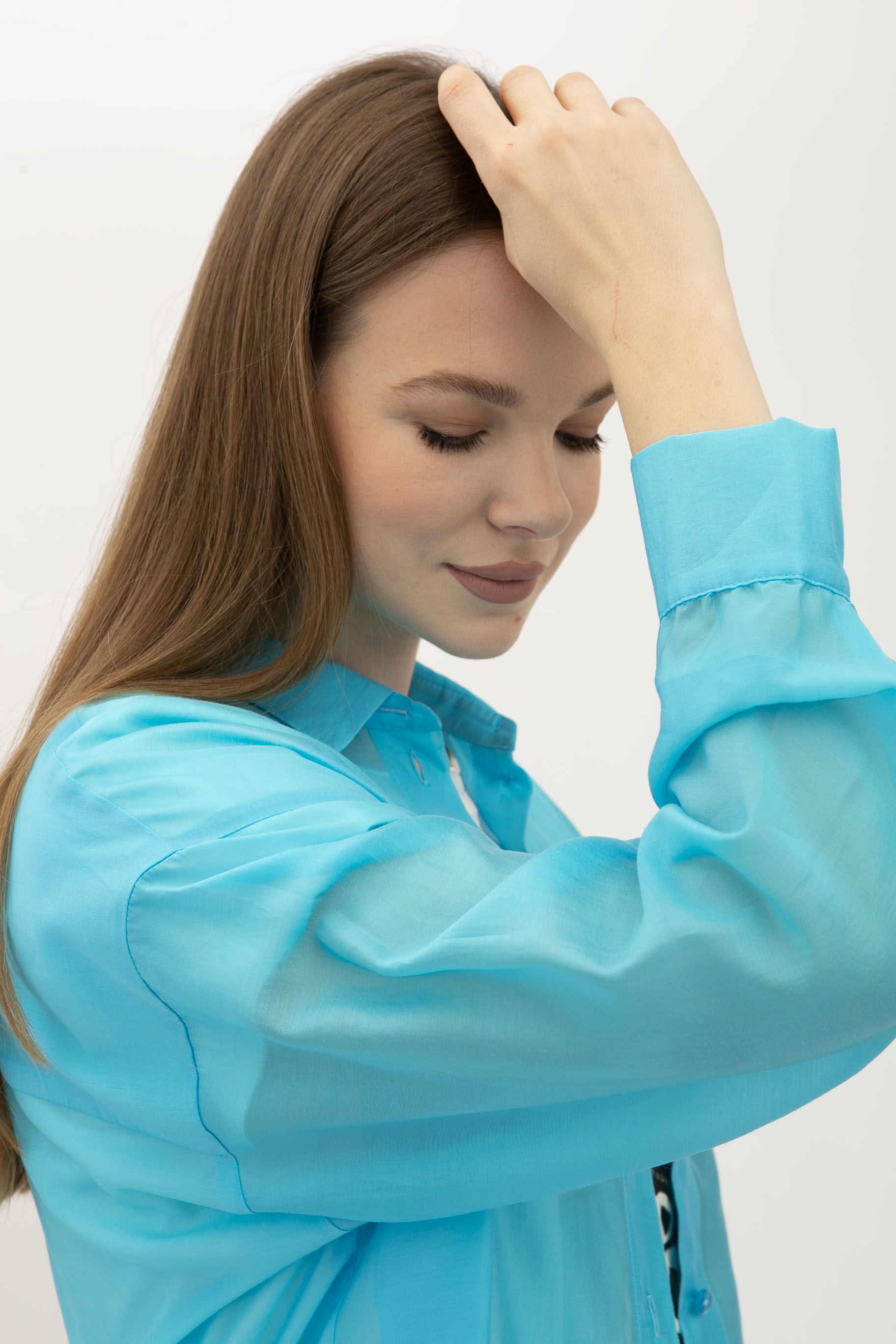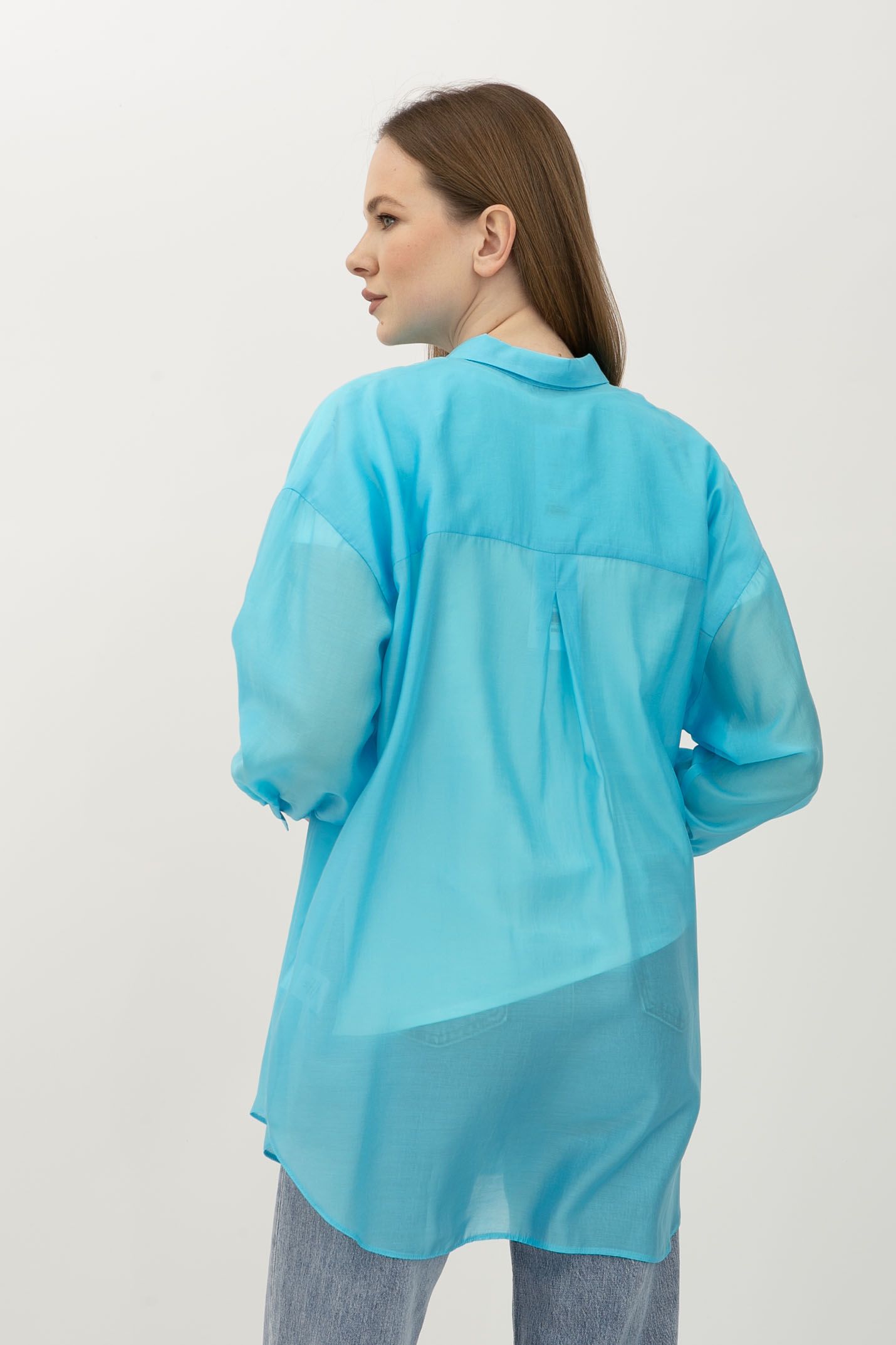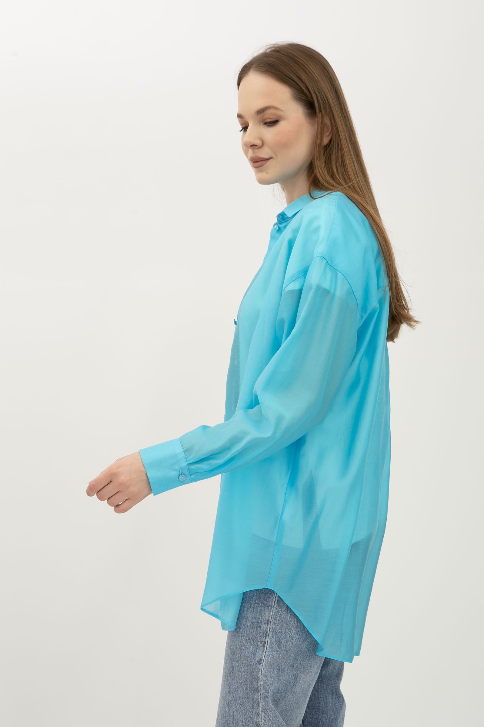 Подовжена напівпрозора блуза блакитна в стилі оверсайз Леора 01 - елегантність та стиль для вас