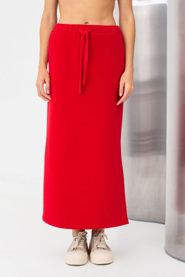 Спідниця трикотажна червоного кольору довжини міді з розрізом Жалін - якість, перевірена часом