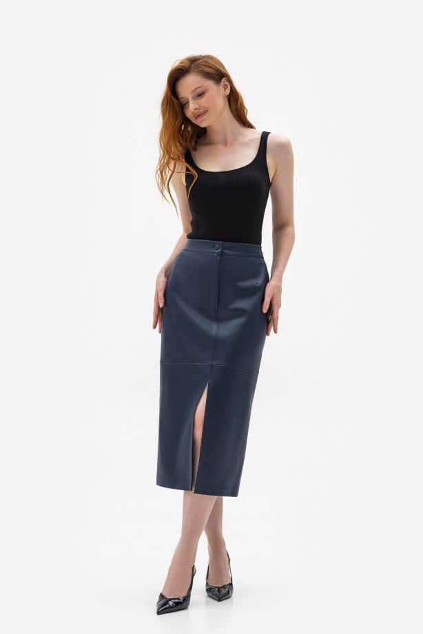 Спідниця міді з екошкіри синього кольору Лафея 02 - будьте в тренді кожного дня