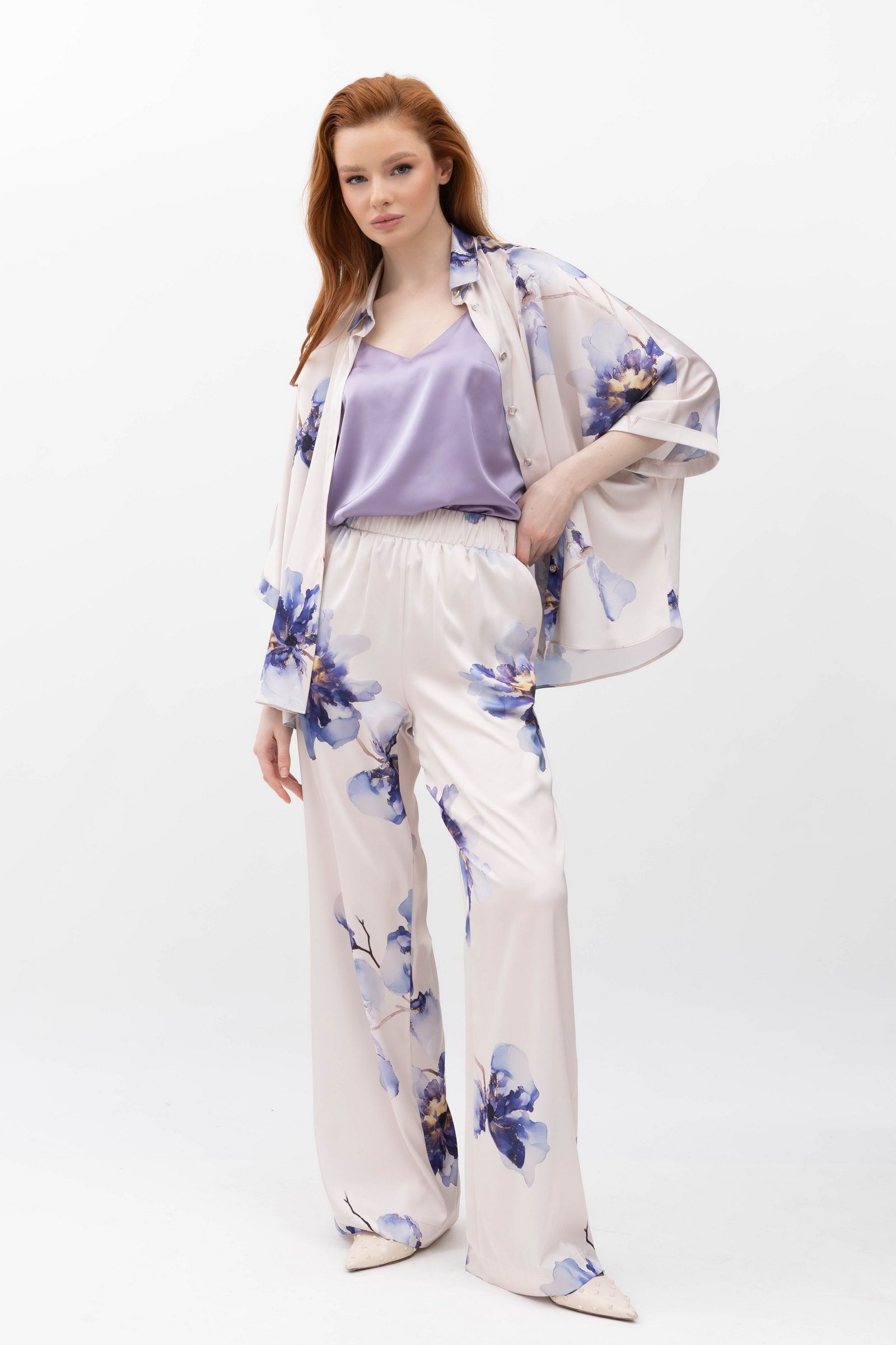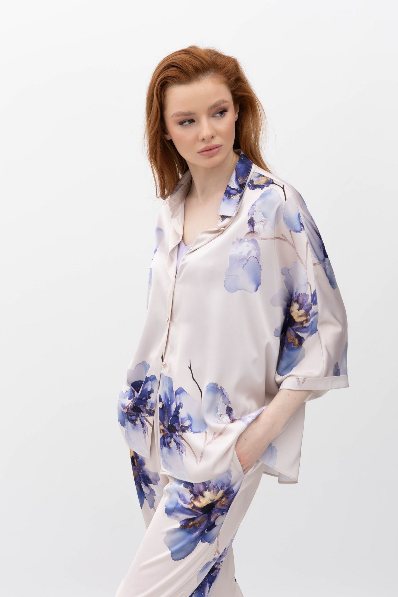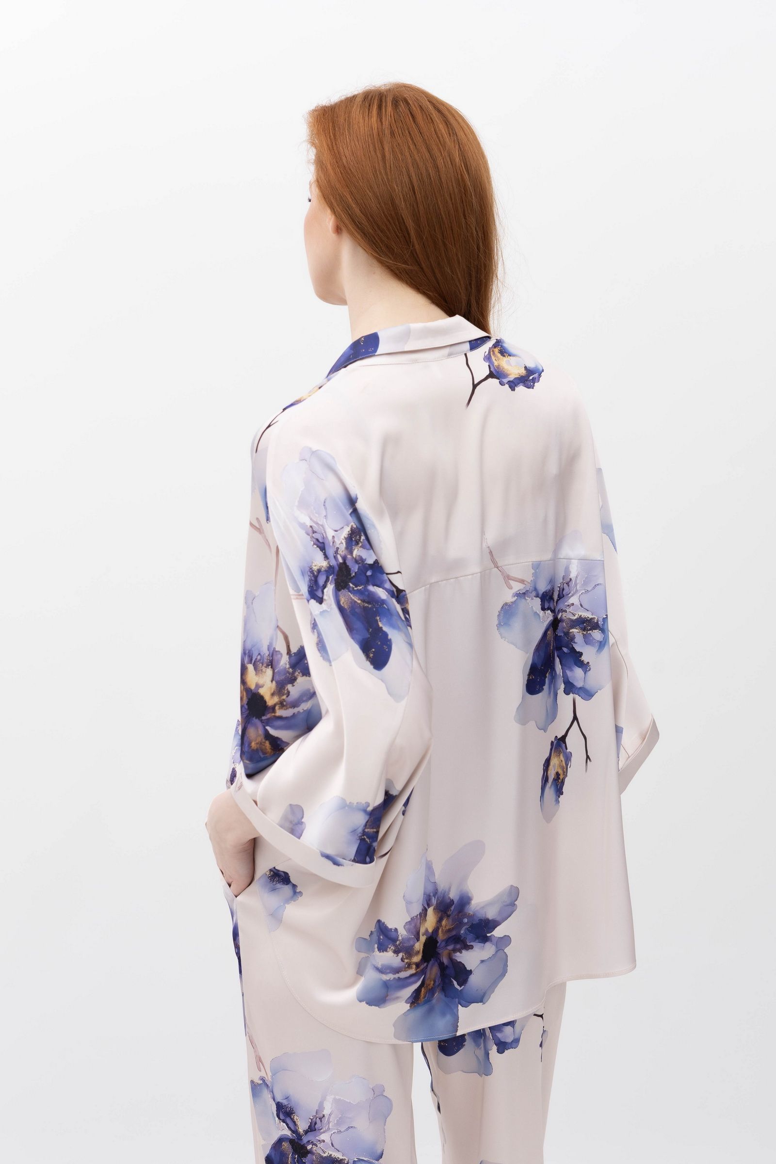 Великі акварельні квіти у синьо-бузкових відтінках на світлому фоні роблять кожну блузу унікальним витвором мистецтва.