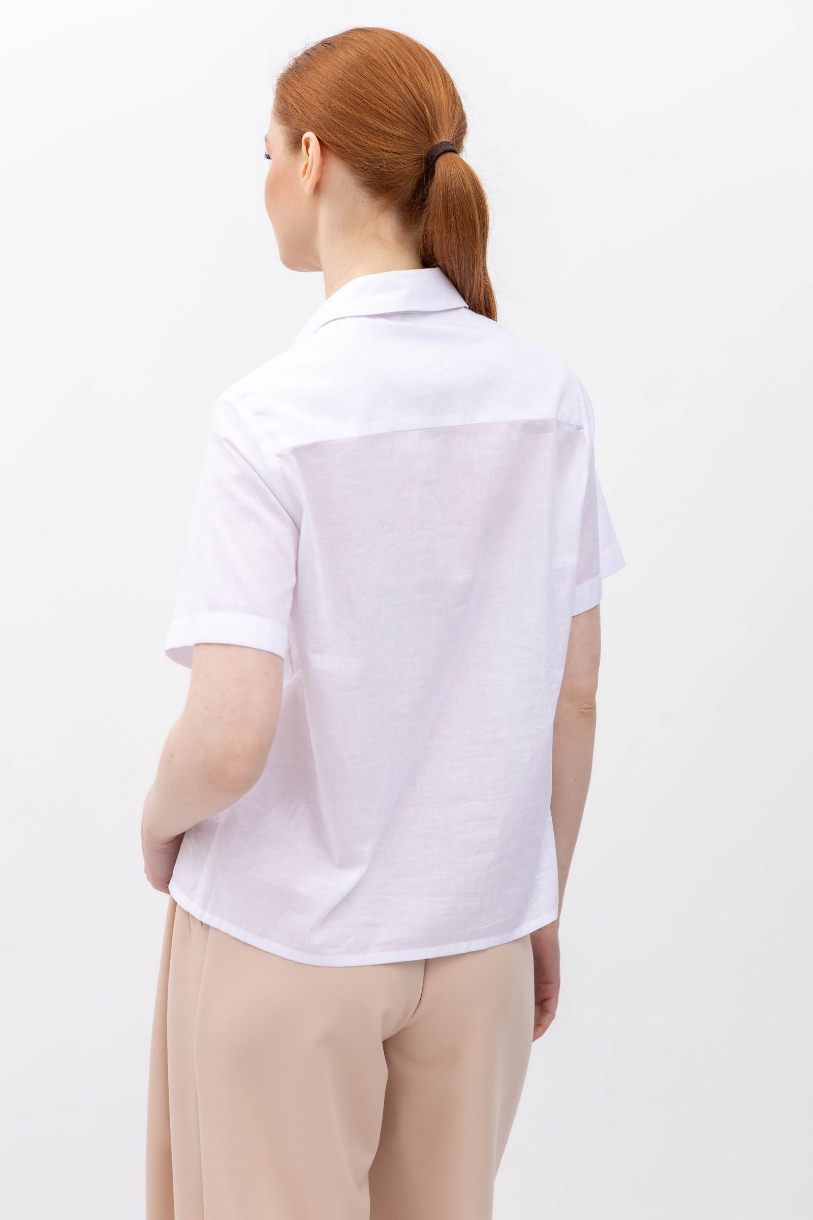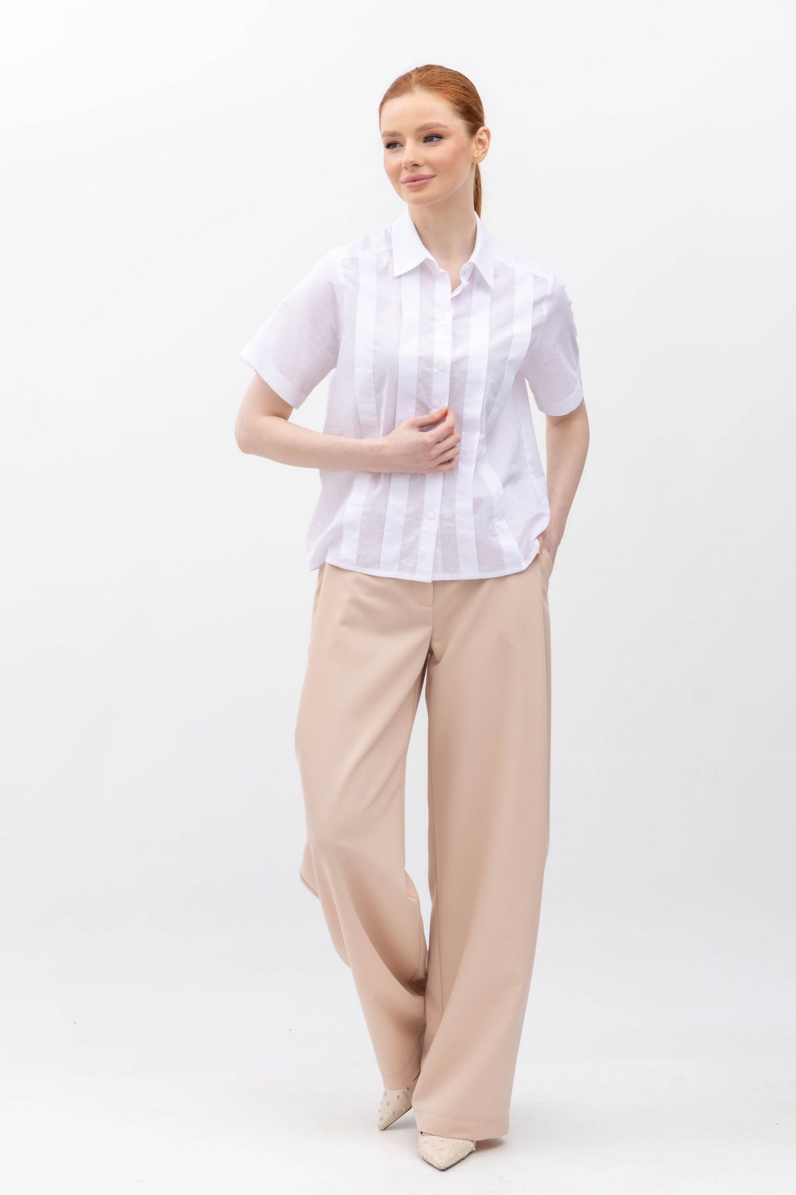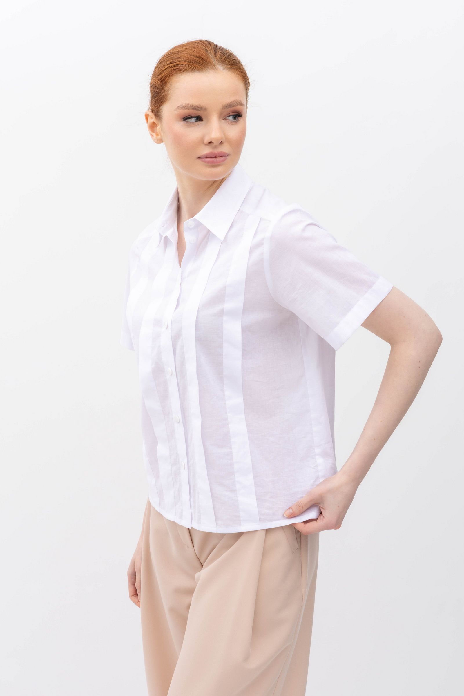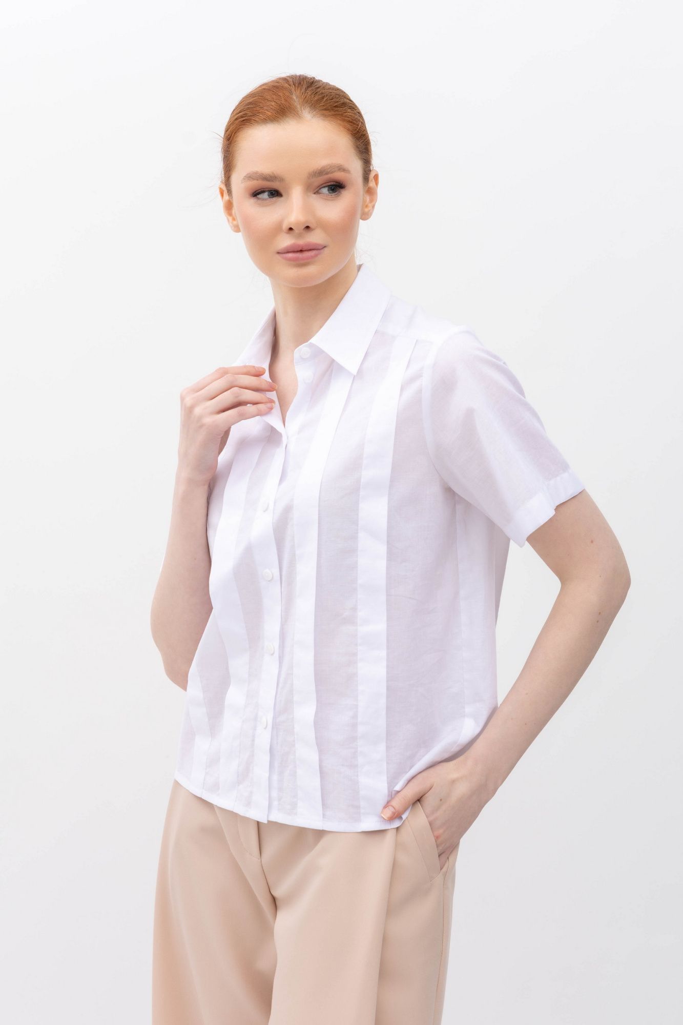 Блуза виконана зі 100% високоякісної бавовни. Тканина дозволяє шкірі дихати, даруючи абсолютний комфорт у найспекотніші дні. Передня частина виробу прикрашена лаконічними вертикальними складками (защипами), які додають моделі фактурності та візуально стрункішають силует. Традиційний сорочковий комір та центральна застібка на планку з ґудзиками роблять блузу універсальною для офісного дрес-коду. На спинці розташована кокетка, яка забезпечує правильну посадку по фігурі та комфорт у рухах.
