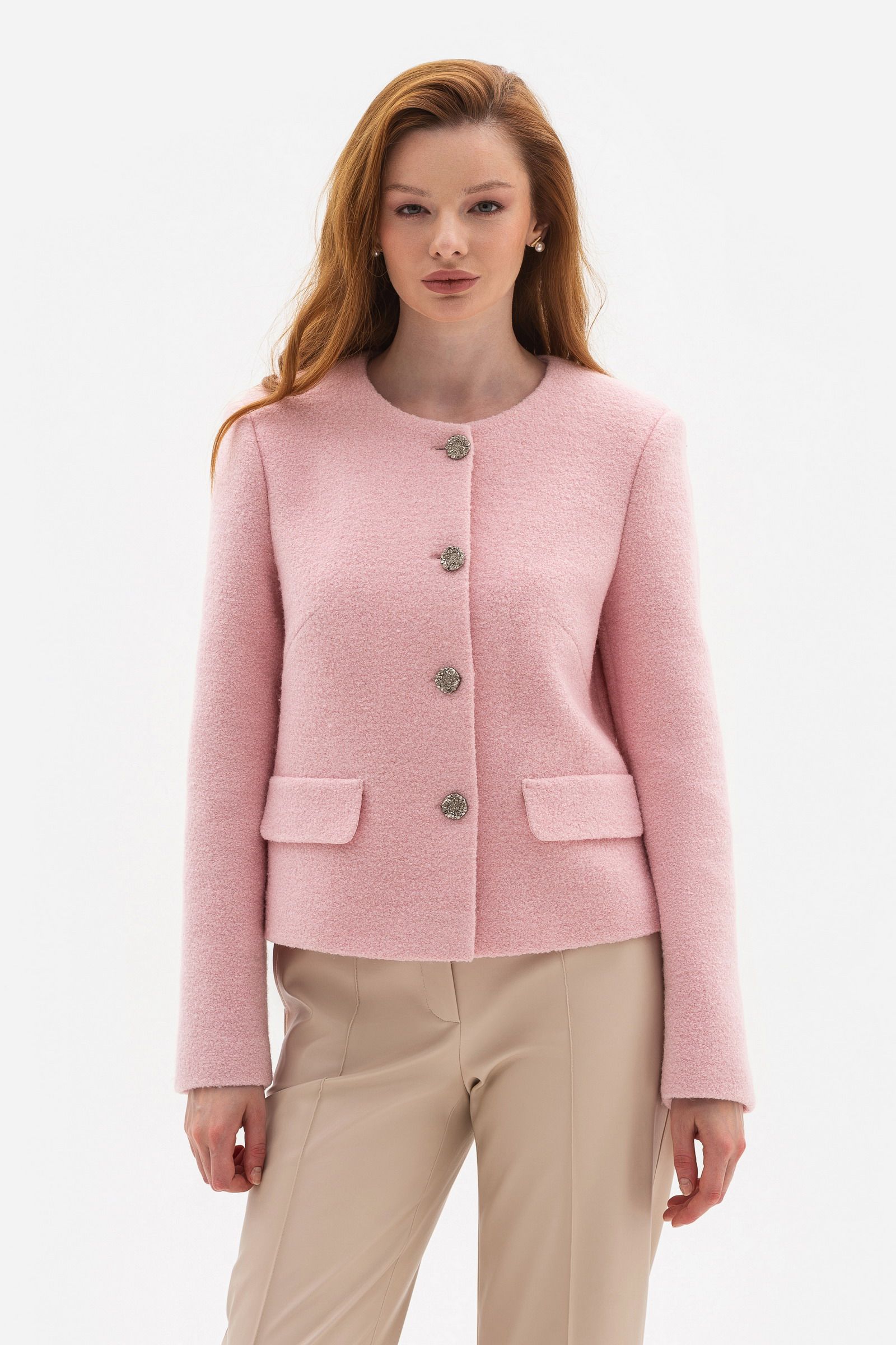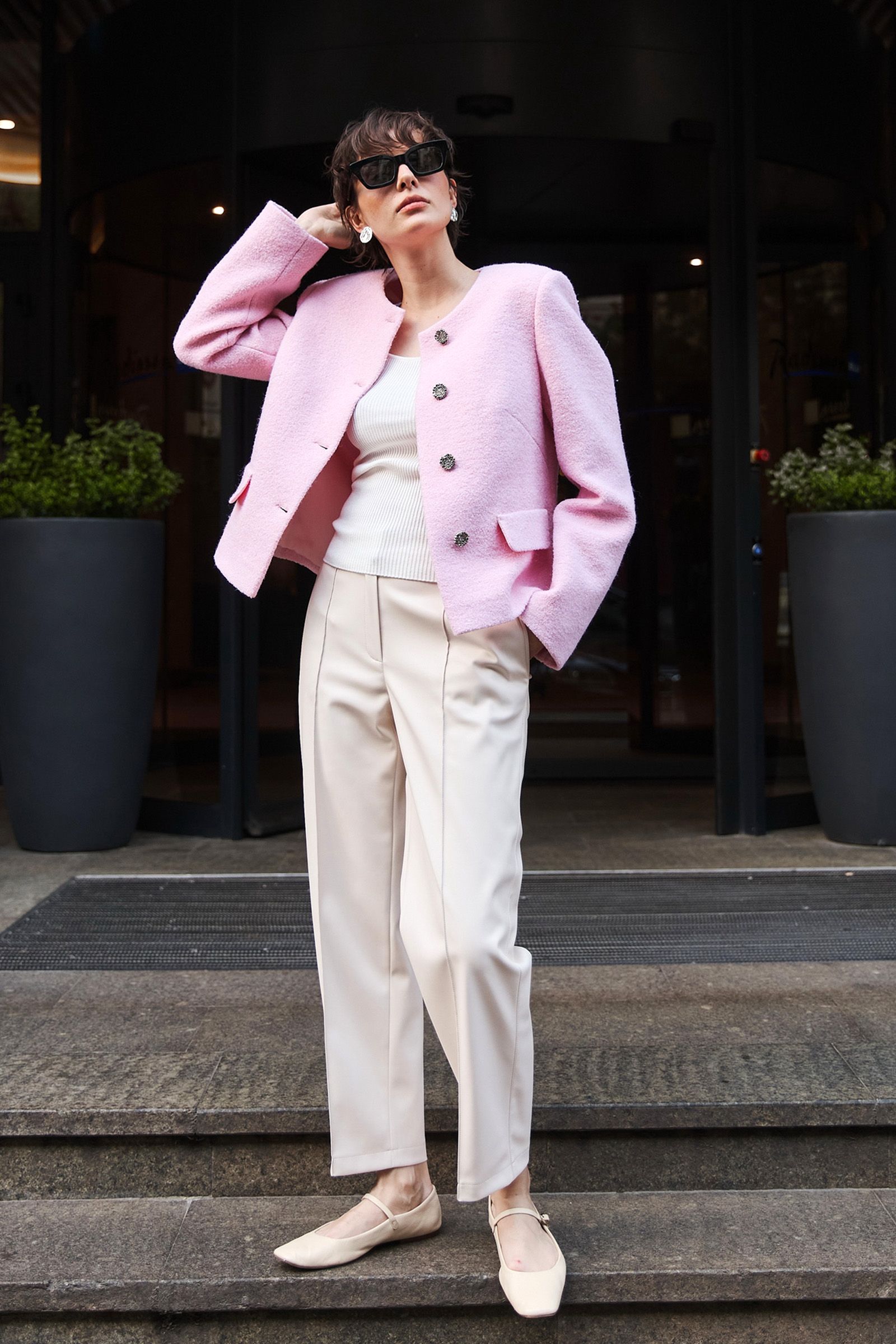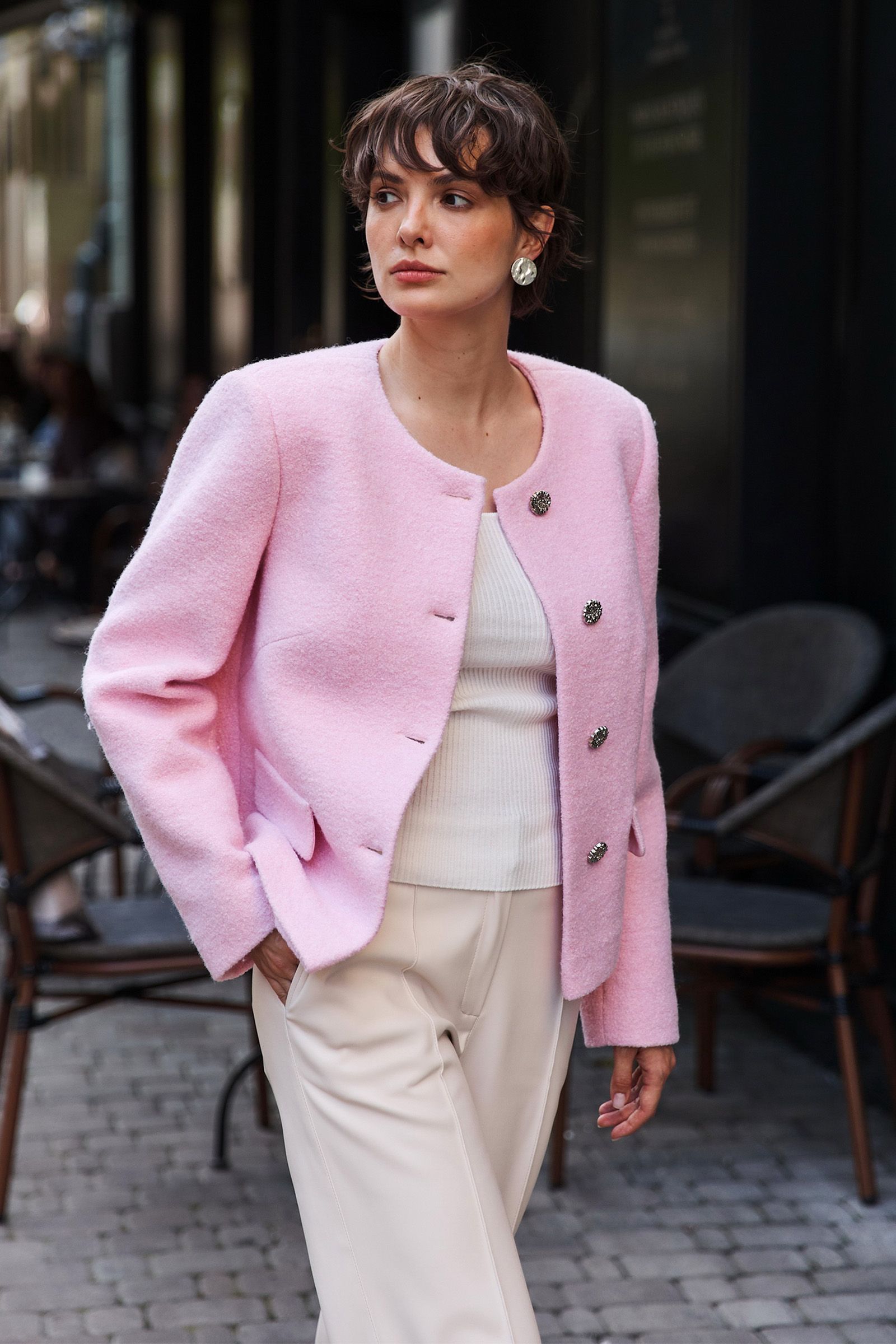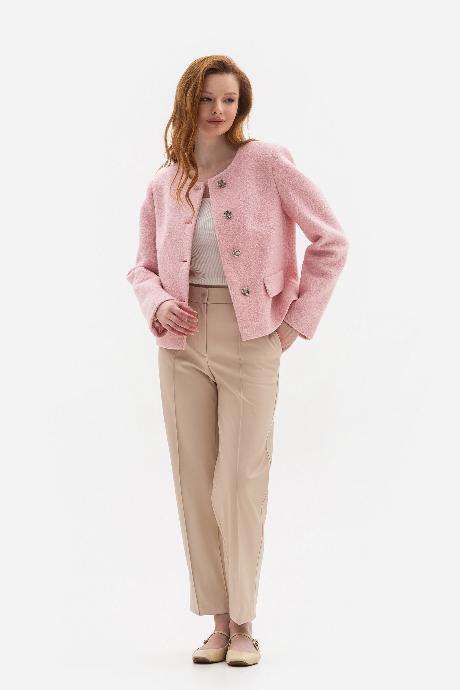 Жакет прямого силуету завдяки вкороченій довжині ідеально комбінується з брюками так з спідницями. М’який рожевий відтінок надає ніжності, та водночас зберігає ділову строгість. Разом ці моделі створюють універсальний лук, у якому комфорт і стиль поєднані в ідеальній гармонії.