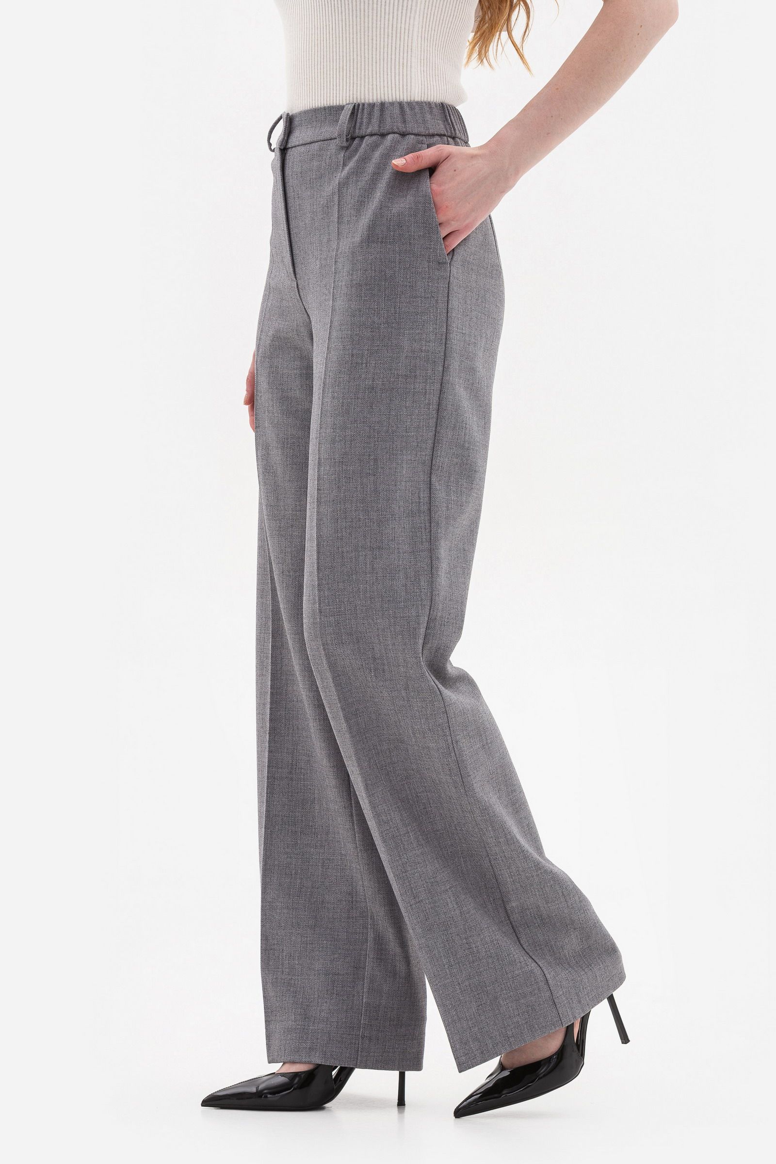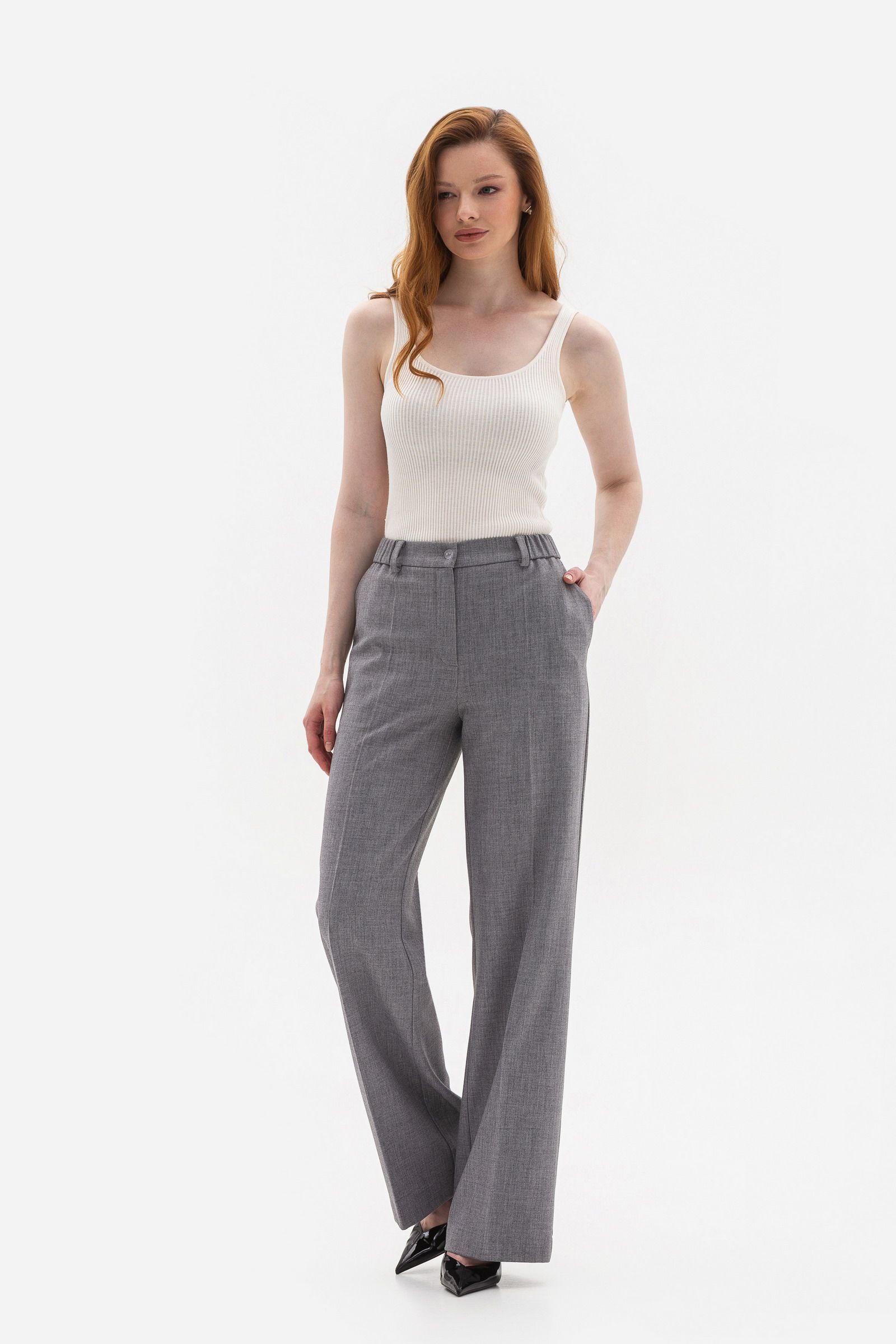 Брюки зі стрілками додають образу структури, зберігаючи при цьому зручність завдяки притачному поясу , який має вставки на резинці по спинці.