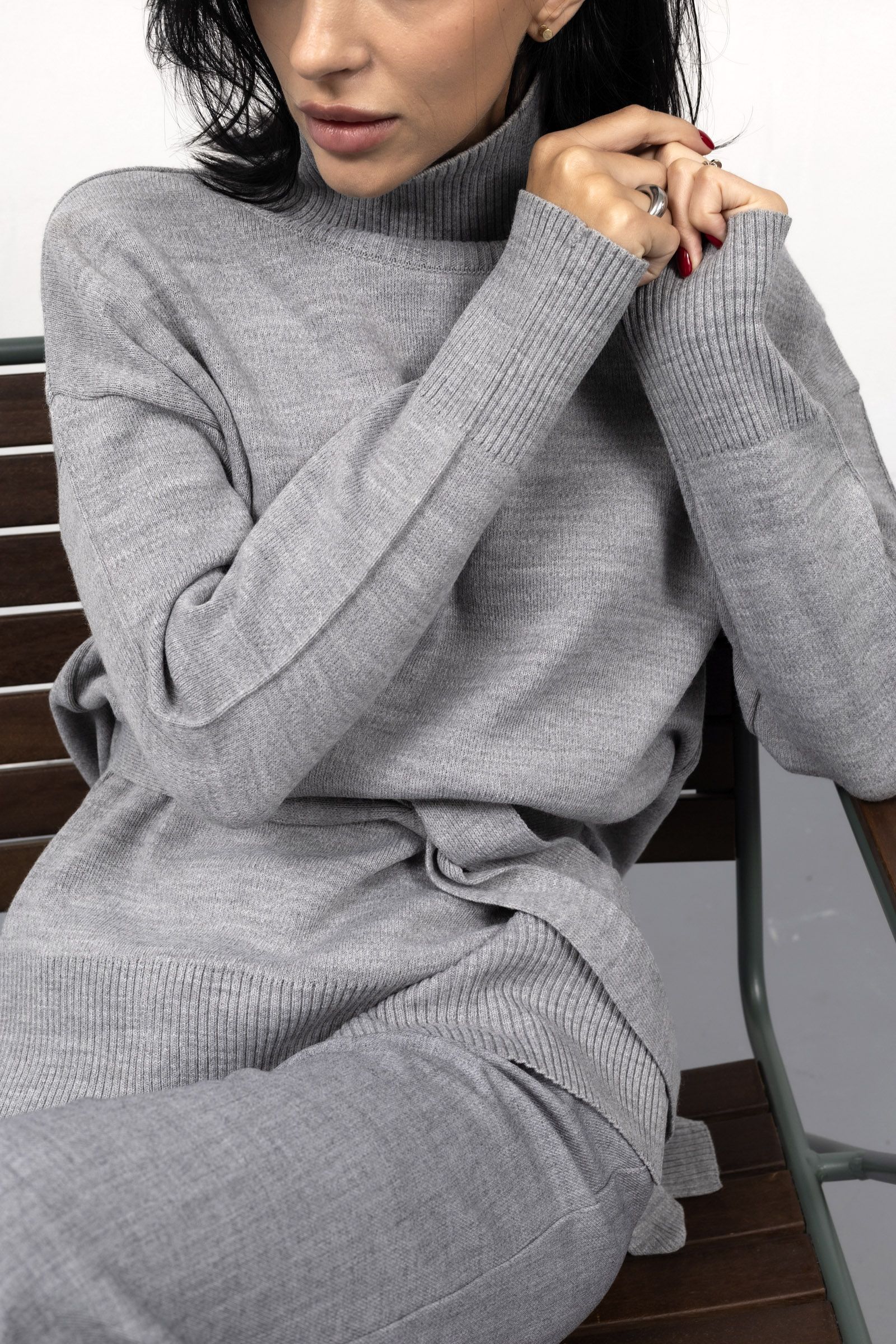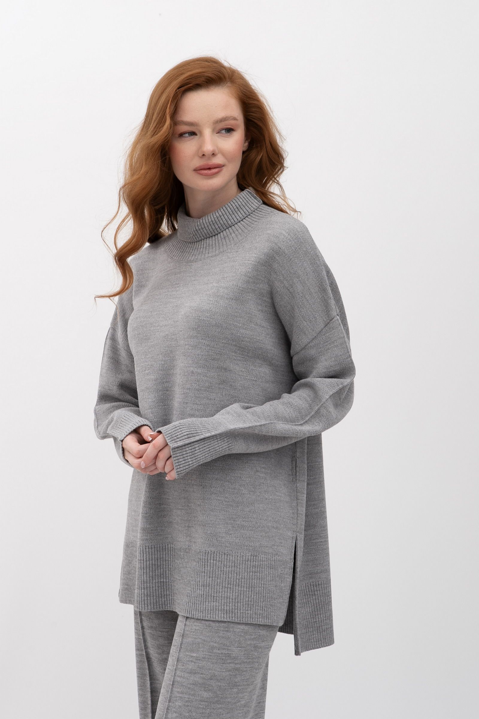 Затишний сірий джемпер з вмістом 25% вовни, високим коміром-стійкою та широким рукавом створює відчуття тепла та захищеності. Його вільний силует та глибокі бічні розрізи вигідно контрастують із чистими лініями брюк, виконаних із костюмної тканини.