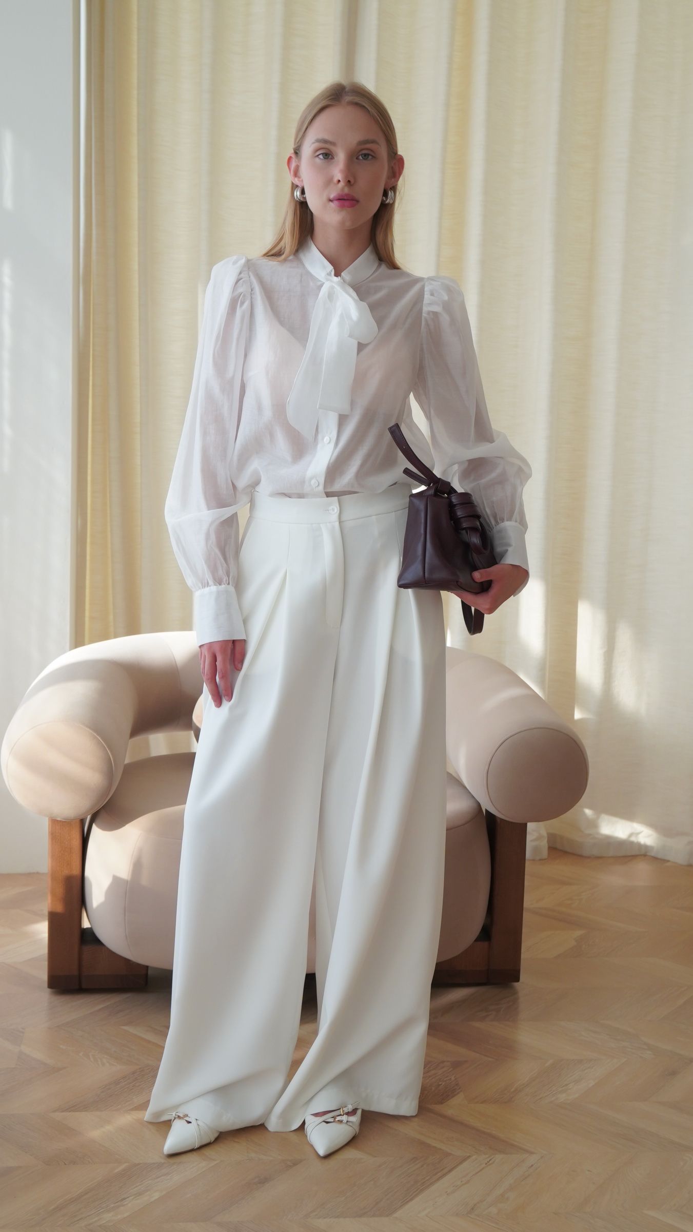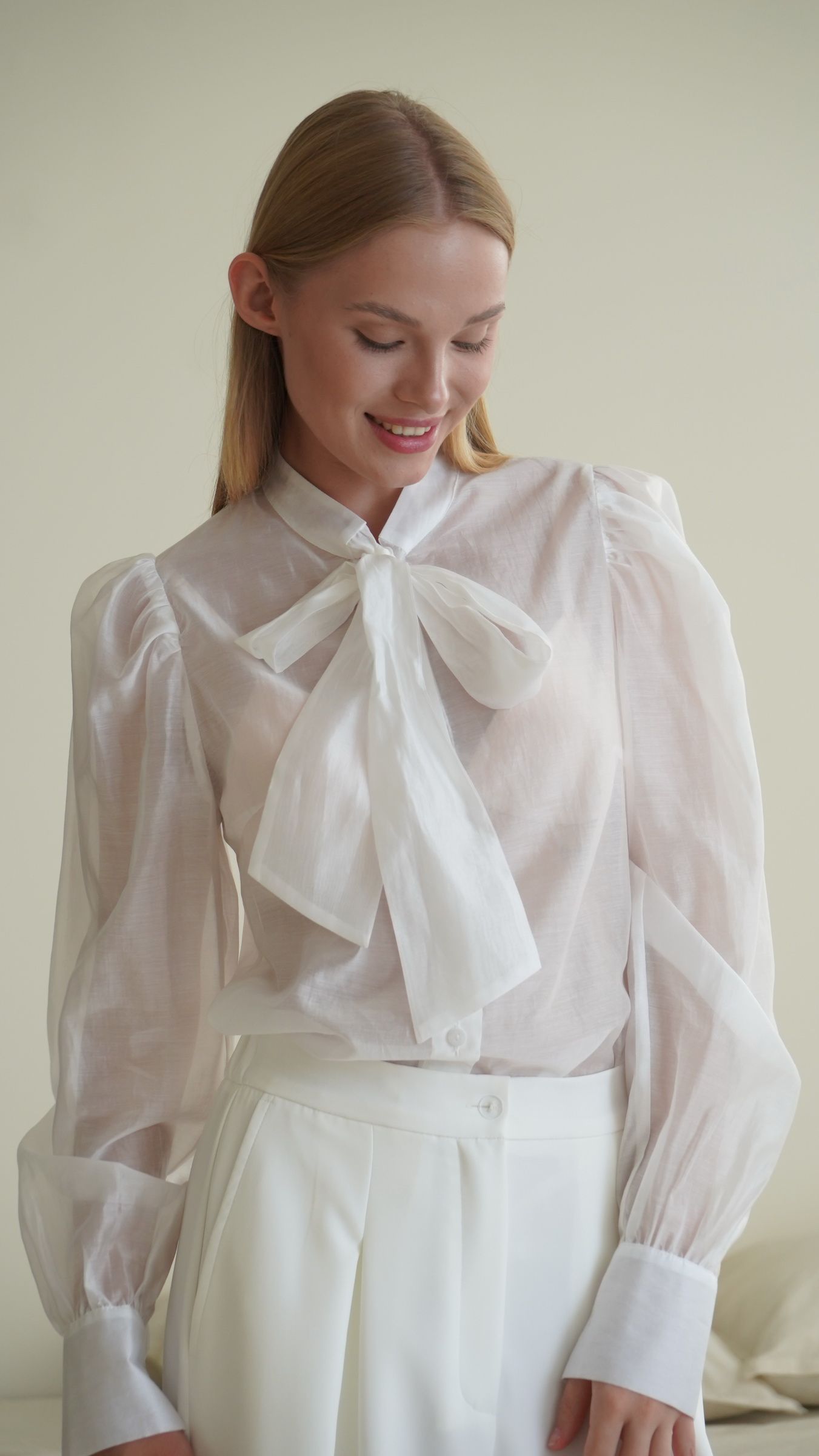 Напівпрозора молочна блуза з романтичними злегка пишними рукавами та декоративним бантом додає образу повітряності та елегантності. Вона ідеально поєднується з широкими брюками з костюмної тканини. Продумані склади спереду на брюках акцентують талію, часткова резинка в поясі на спинці забезпечує максимальний комфорт.