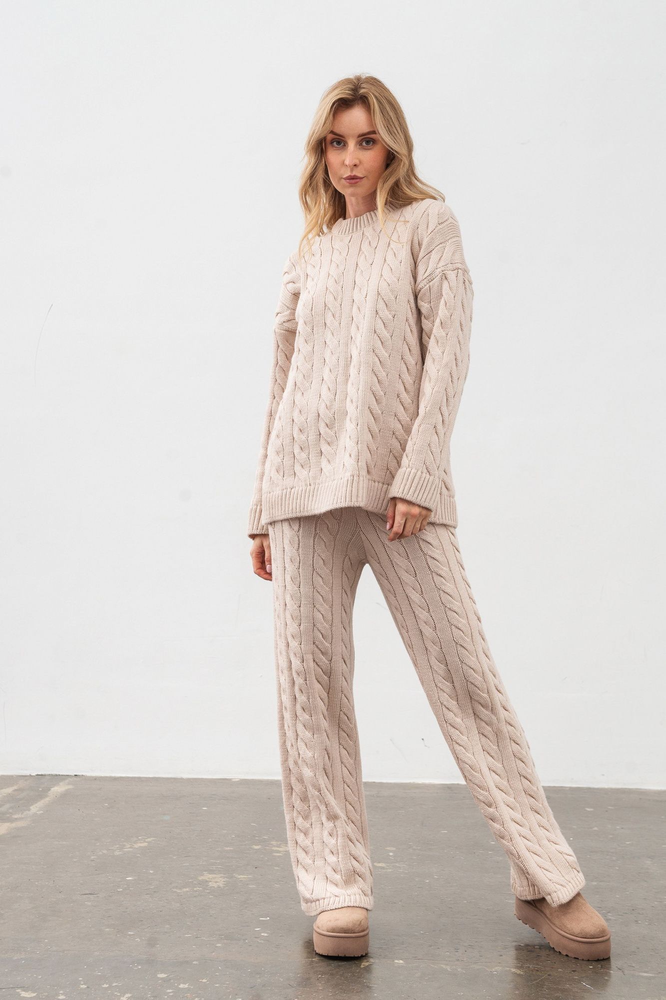 В'язаний жіночий костюм бежевого кольору джемпер та штани 4598/2024 - створіть свій унікальний образ